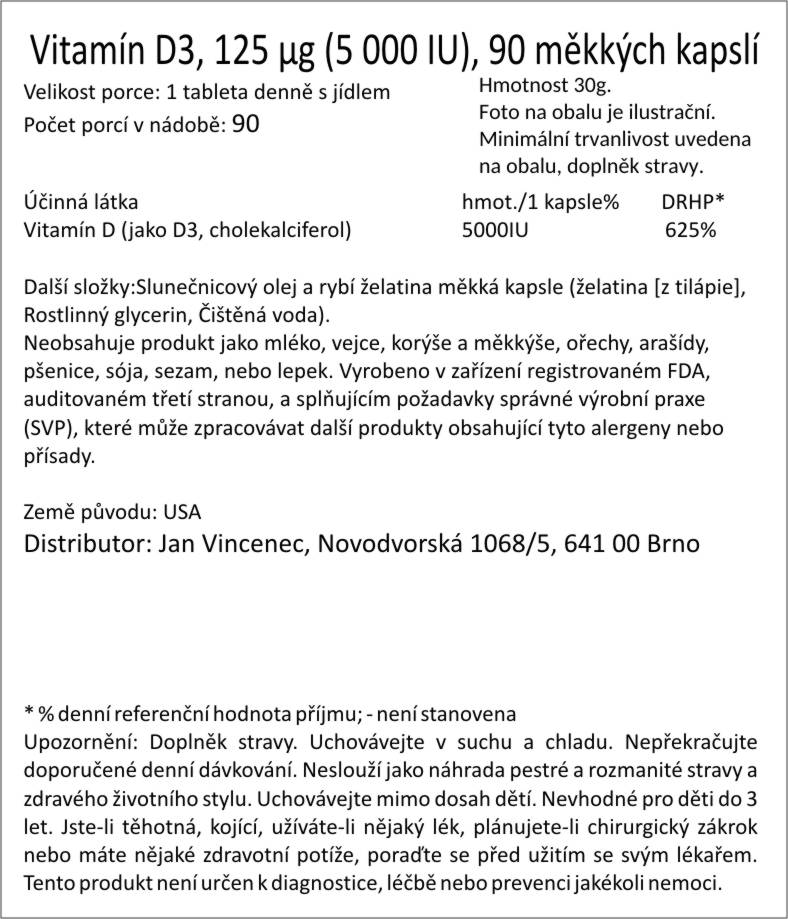 Vitamín D3, 125 μg (5 000 IU), 90 měkkých kapslí